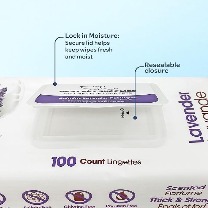 Best Pet Supplies 8″ x 9″ Pet Grooming Wipes for Dogs & Cats, 100 Pack, Plant-Based Deodorizer for Coats & Dry, Itchy, or Sensitive Skin, Clean Ears, Paws, & Butt – Calming Lavender