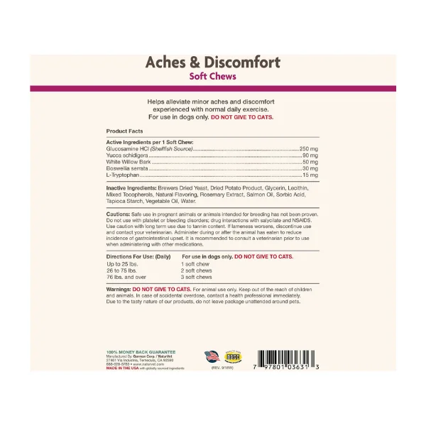 NaturVet Aches & Discomfort Dog Soft Chews help alleviate minor aches and discomfort experienced with normal daily exercise. Glucosamine provides extra support to help maintain healthy joint function while Yucca schidigera, Boswellia serrata and White Willow Bark work synergistically to help alleviate aches and discomfort.