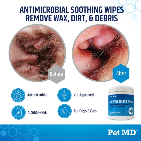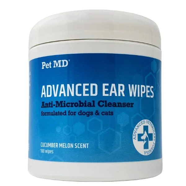 Pet MD Advanced Dog & Cat Ear Cleaner Wipes make it one step easier to clean your canine or feline fur-iend?s ears. These convenient wipes contain an alcohol-free, non-irritating cleanser formulated to prevent microbial activity. They gently clean, dry and acidify the ear canal to eliminate odor without stinging or burning. Featuring a refreshing cucumber melon scent, they?re even gentle enough for daily use.