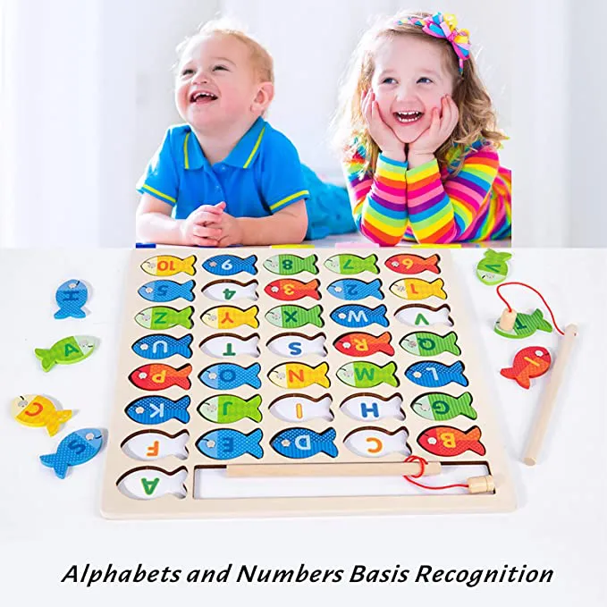 How to Play Fishing Game: Return all letters and numbers to the corresponding cognitve board, and then use a special magnetic fishing rod to fish the letters or numbers that the children want on the cognitve board. We have 2 fishing poles that can also interact with other children to fish. Find out who catches more fish, or let your kids use their imaginations to create their own unique gameplay.