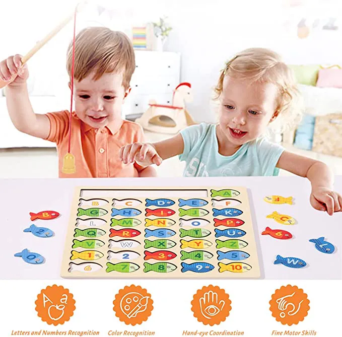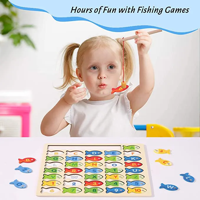 Wooden Magnetic Fishing Game: This creative and playful fishing game can provide hours of fun for your kids, it contains 26 letter wooden fish and 10 number wooden fish, 2 wooden magnetic fishing poles, 1 wooden sorting board, it is a good toy for children to learning letters and numbers and recognizing colors.